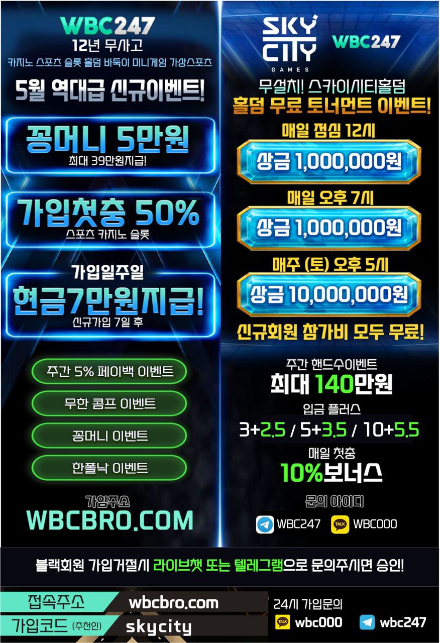 WBC247 5월 신규 이벤트, 첫충50%+5만원쿠폰 무료 토너먼트!!!