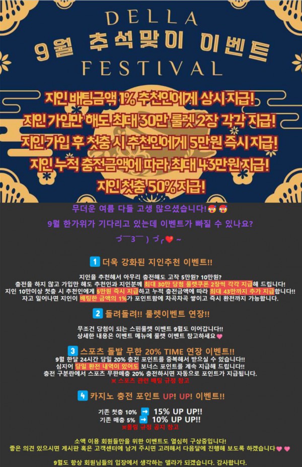 $델라$ 9월 한정 여름 이벤트!! 역대급 돌발 이벤트!! 첫가입 첫충 50% 매충 20% 카지노15% 역대급 이벤트!