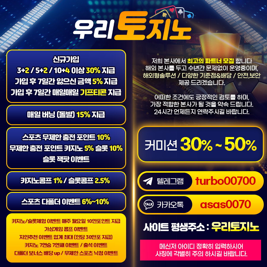 메이저사이트 "우리토지노"에서는 파트너모집 하고 있습니다.