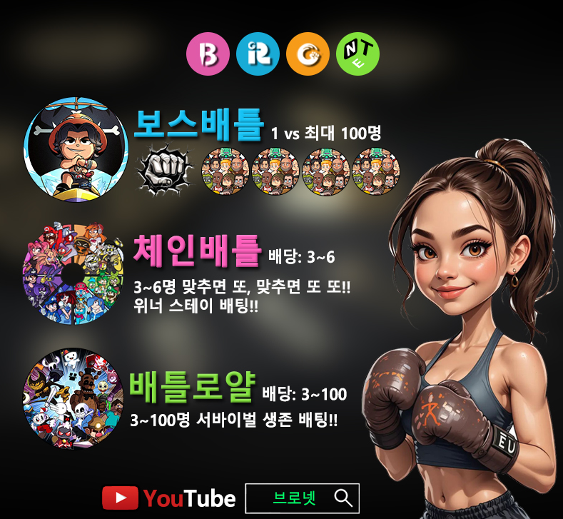 배틀로얄(배당:3~100),보스배틀(1:100게임),체인배틀(배당:3~6) 3가지 게임