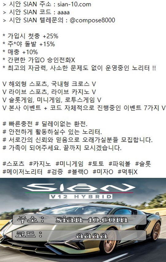 SIAN 시안 첫25% 매첫10%매5%매5%매5% 스 카 미 전게임 이용가능 루틴마틴찍먹O > 업체홍보 | 먹튀검증 스포츠정보 꽁머니