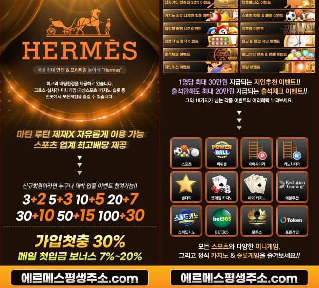 국내 최대자본금 인증 토토사이트 에르메스 가입코드 8822 가입첫충 30% 입플 3+2부터 대량이벤트진행중