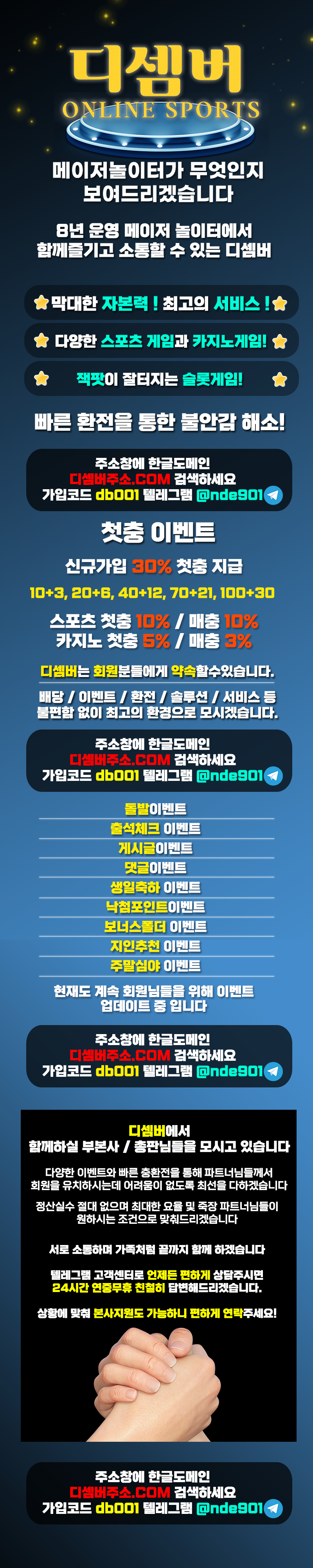메이저사이트 업체홍보 구간으로 여러분들도 함께 동참하시는 공간입니다. 메이저사이트를 이용하시면서 이곳은 꼭 공유하고싶다 하는 곳이 있다면 공유해주세요. 저희는 사이트 업체홍보를 하시는 분께 소정의 포인트를 드리고 있습니다. 이벤트 공지를 참고하시고 꼭 포인트 받아가세요. 또한 메이저사이트 아닌 불편한 홍보글이나 광고를 신고하신 분께 포인트를 지급해드립니다. 언제나 먹튀업체가 아닌 확실한 업체홍보를 부탁드립니다. 항상 건승 하시고 즐거운 시간 되시길 기원합니다.