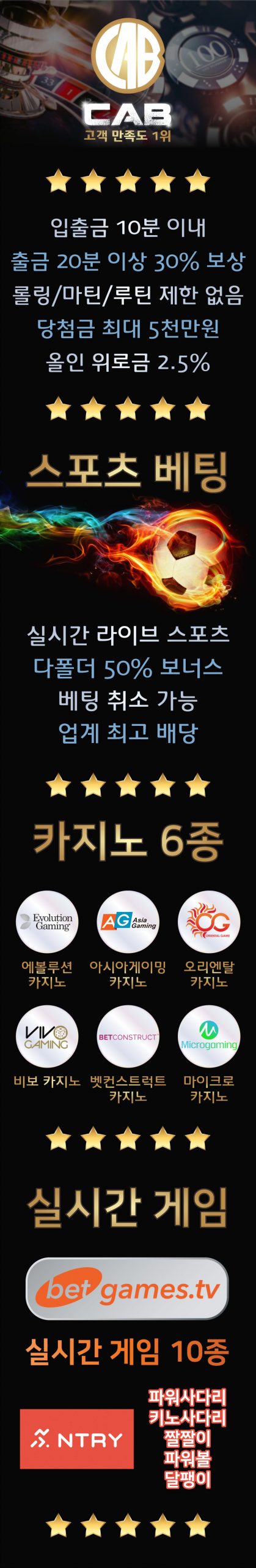 CAB은 다년간 성공적인 운영과 안정적인 서비스를 제공해 업계의 최고 사이트로 자리 잡았습니다. 아시아, 유럽 및 미주 최고의 파트너사들과 연합하여 스포츠 베팅과 다양한 카지노 서비스 및 실시간 게임을 제공하며 다음드, 슈어맨 등 사설 인증 업체에서 검증된 사이트입니다.