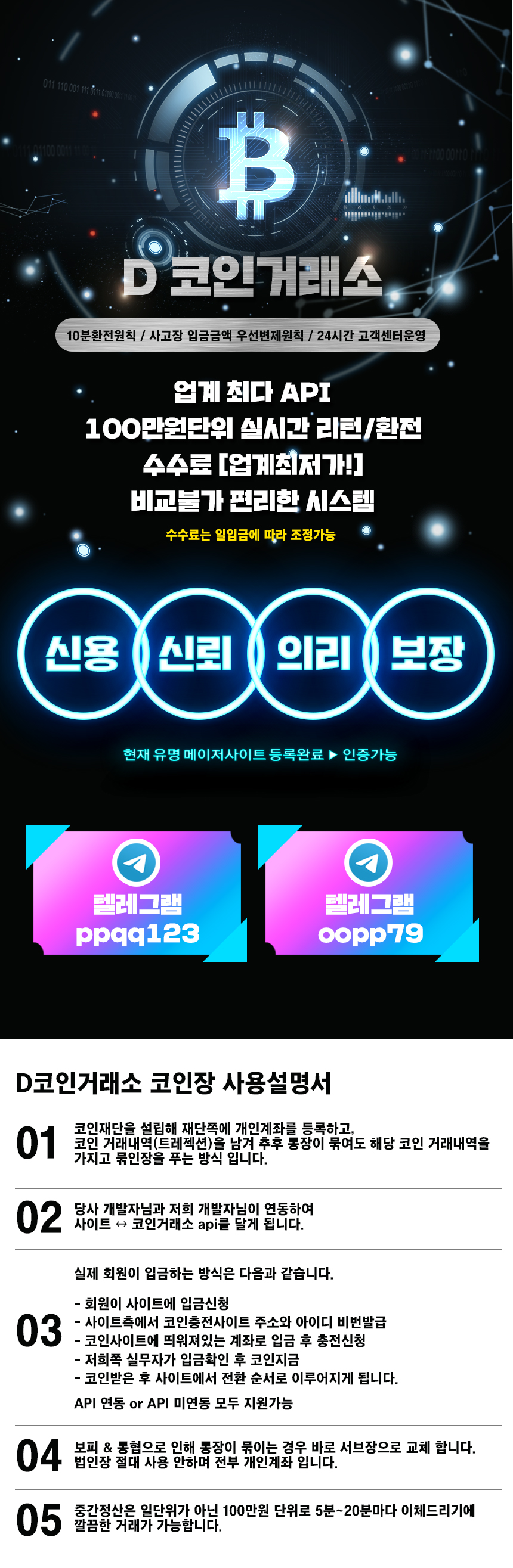 거래 업체별 3명의 담당직원이 배정되어 24시간입금처리 및 텔레그램으로 소통이 가능하며, 실시간 입금내역을 확인하실수 있는 뷰장을 공유해드리고 있습니다.