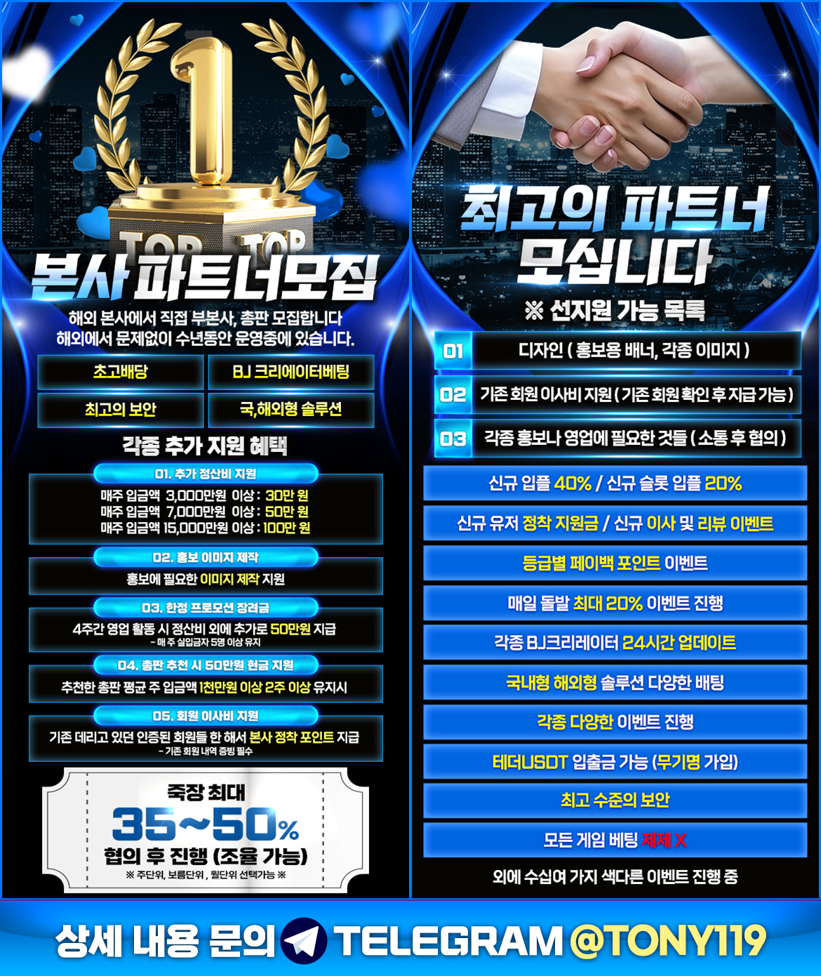 각종 사고 X 배팅 제재 X 국해외형 다양한 베팅 / 24시간 크리레이터 발매 / 본사 파트너 모집합니다.