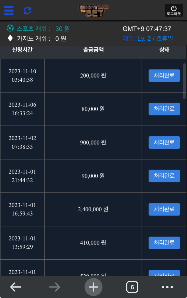 안녕하세요 9월부터 쇼미더벳을 이용하기 시작했는데 몇개월 이용해보고 후기남깁니다 일단 느낀점은 솔루션이랑 사이트 디자인이 깔끔하구요 스포츠걸때 기준점도 다양하고 걸경기도 많아서 좋았습니다 미겜도 여러가지게임들을 지원해서 좋구요 바카라도 가끔씩하는데 이용하는데 문제는 따로 없구요 그리고 돌발입플 같은 다른사이트에서 잘안하는 이벤트도 자주하는거 같고 매충이랑 돌발이벤트도 자주해서 엄청 좋습니다 충전이랑 환전같은 부분도 지연없이 빠르고 깔끔하게 이루어지고 고객센터도 빠르고 친절하게 대응해주셔서 아주좋습니다 아직 가입안하신분들 있다면 한번 가입하셔서 이용해보세용 사진은 제 환내역입니다