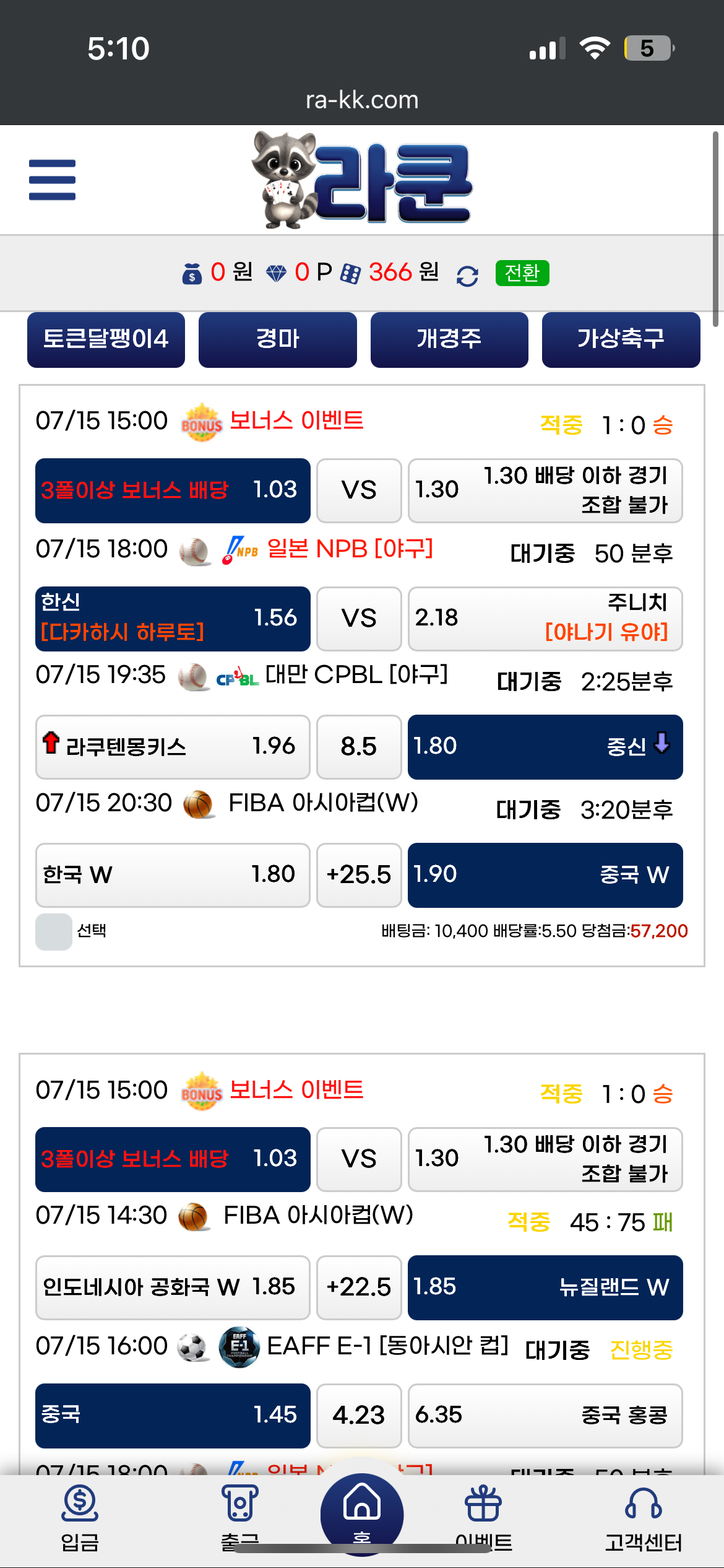 라쿤 스포츠 배당이 미쳤네요 그리고 회원들 항상 잘챙겨주고 카지노 롤링 적어서 너무 좋아요 앞으로 자주쓸거같아요