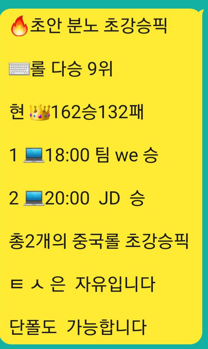 메이저사이트 프리미엄픽 공간입니다. 여기서 제공하는 픽을통해 검증된 메이저사이트에 배팅 하실때 유용한 정보입니다. 유출픽이 아닌 정상픽입니다. 유저님들이 이용가능한 사이트에 저희픽을 이용해 베팅하셔두 무방하십니다. 다만 무단배포 적발시 경고없이 탈퇴처리 되십니다. 저희 제휴 메이저사이트에 베팅하셔도 무방합니다. 이곳 프리미엄픽은 높은 승률을 자랑하며 선별한 픽만을 제공합니다.