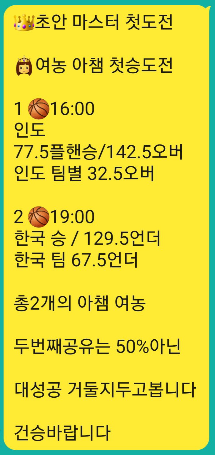 22:53	메이저사이트 프리미엄픽 공간입니다. 여기서 제공하는 픽을통해 검증된 메이저사이트에 배팅 하실때 유용한 정보입니다. 유출픽이 아닌 정상픽입니다. 유저님들이 이용가능한 사이트에 저희픽을 이용해 베팅하셔두 무방하십니다. 다만 무단배포 적발시 경고없이 탈퇴처리 되십니다. 저희 제휴 메이저사이트에 베팅하셔도 무방합니다. 이곳 프리미엄픽은 높은 승률을 자랑하며 선별한 픽만을 제공합니다.