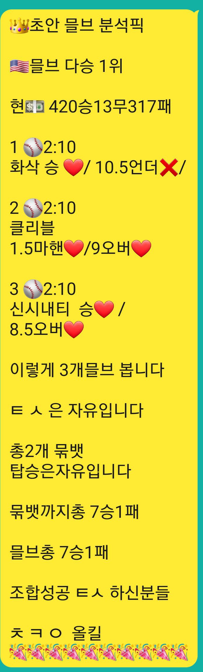 09:59 메이저사이트 프리미엄픽 공간입니다. 여기서 제공하는 픽을통해 검증된 메이저사이트에 배팅 하실때 유용한 정보입니다. 유출픽이 아닌 정상픽입니다. 유저님들이 이용가능한 사이트에 저희픽을 이용해 베팅하셔두 무방하십니다. 다만 무단배포 적발시 경고없이 탈퇴처리 되십니다. 저희 제휴 메이저사이트에 베팅하셔도 무방합니다. 이곳 프리미엄픽은 높은 승률을 자랑하며 선별한 픽만을 제공합니다.