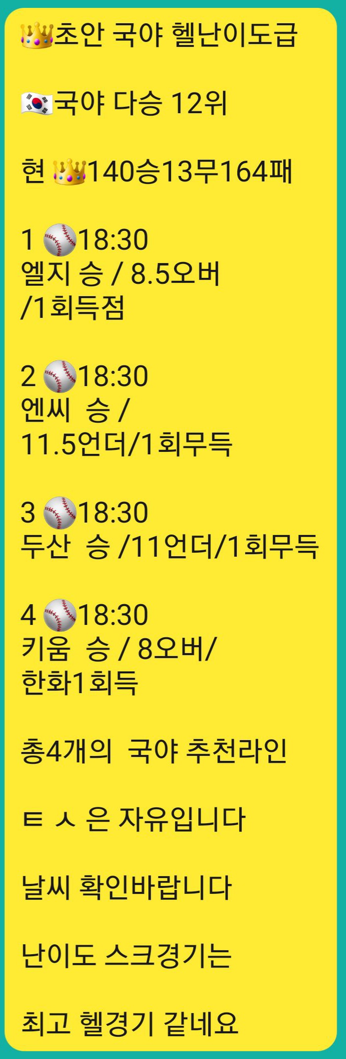 22:00 메이저사이트 프리미엄픽 공간입니다. 여기서 제공하는 픽을통해 검증된 메이저사이트에 배팅 하실때 유용한 정보입니다. 유출픽이 아닌 정상픽입니다. 유저님들이 이용가능한 사이트에 저희픽을 이용해 베팅하셔두 무방하십니다. 다만 무단배포 적발시 경고없이 탈퇴처리 되십니다. 저희 제휴 메이저사이트에 베팅하셔도 무방합니다. 이곳 프리미엄픽은 높은 승률을 자랑하며 선별한 픽만을 제공합니다.
