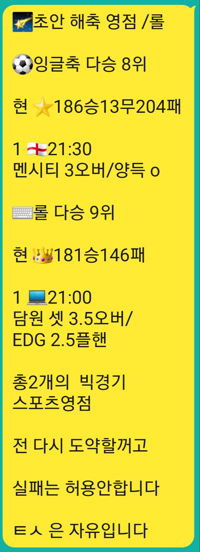 22:12 메이저사이트 프리미엄픽 공간입니다. 여기서 제공하는 픽을통해 검증된 메이저사이트에 배팅 하실때 유용한 정보입니다. 유출픽이 아닌 정상픽입니다. 유저님들이 이용가능한 사이트에 저희픽을 이용해 베팅하셔두 무방하십니다. 다만 무단배포 적발시 경고없이 탈퇴처리 되십니다. 저희 제휴 메이저사이트에 베팅하셔도 무방합니다. 이곳 프리미엄픽은 높은 승률을 자랑하며 선별한 픽만을 제공합니다.