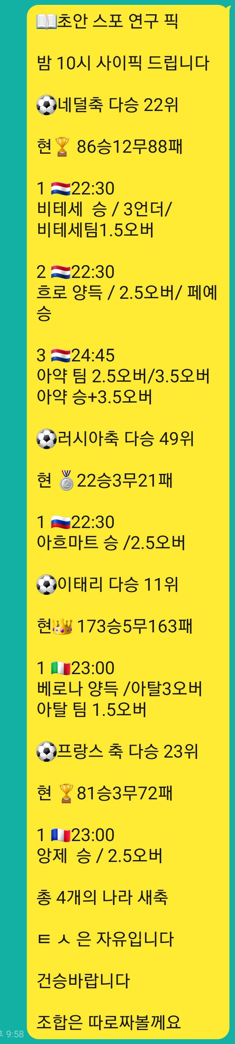 07:51 메이저사이트 프리미엄픽 공간입니다. 여기서 제공하는 픽을통해 검증된 메이저사이트에 배팅 하실때 유용한 정보입니다. 유출픽이 아닌 정상픽입니다. 유저님들이 이용가능한 사이트에 저희픽을 이용해 베팅하셔두 무방하십니다. 다만 무단배포 적발시 경고없이 탈퇴처리 되십니다. 저희 제휴 메이저사이트에 베팅하셔도 무방합니다. 이곳 프리미엄픽은 높은 승률을 자랑하며 선별한 픽만을 제공합니다.