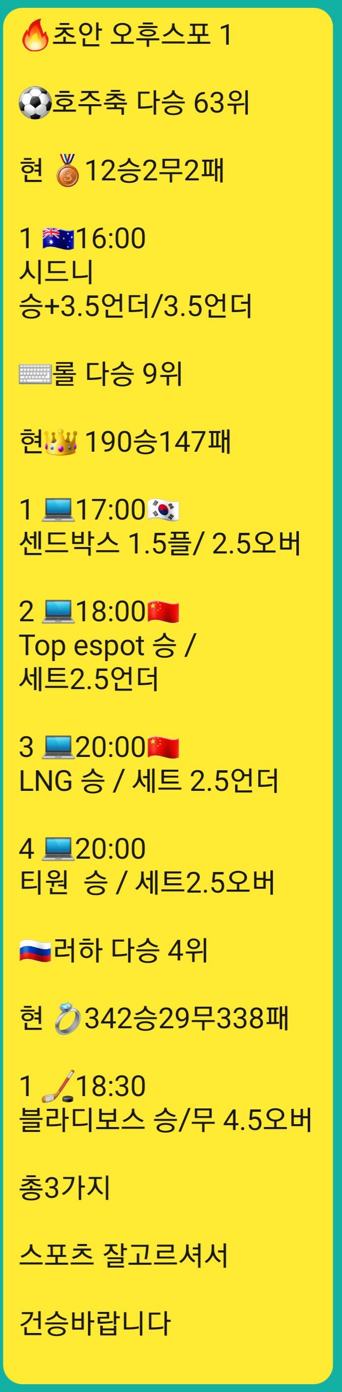 메이저사이트 프리미엄픽 공간입니다. 여기서 제공하는 픽을통해 검증된 메이저사이트에 배팅 하실때 유용한 정보입니다. 유출픽이 아닌 정상픽입니다. 유저님들이 이용가능한 사이트에 저희픽을 이용해 베팅하셔두 무방하십니다. 다만 무단배포 적발시 경고없이 탈퇴처리 되십니다. 저희 제휴 메이저사이트에 베팅하셔도 무방합니다. 이곳 프리미엄픽은 높은 승률을 자랑하며 선별한 픽만을 제공합니다.