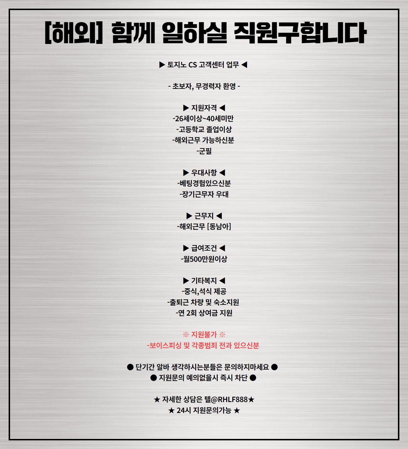구인 [해외] 성실하게 장기근무하실 분 구합니다. 페이지 정보 작성자 welcome 전체게시물 전체게시물 조회706 읽음 0개의 댓글 페이지 정보 등록일 24년 04월 06일 00:04 커미션 마감일 24년 05월 31일 23:59 마감시간 본문 - 추천 0 목록 이전글베트남 어드민,cs 일자리 구합니다. 24.04.06 다음글사장님들 사이트 일자리 구합니다 24.04.05 마케팅 센터가 오픈되었습니다.본사 부본사 총판 여러분들이 이용하시며 서로 winwin 할 수 있는 홍보공간 입니다.글쓰기 권한 문의는 아래 텔레그램으로 연락주시기 바랍니다.글쓰기 권한 문의 시간은 오전10시~오후10시 까지이며 일요일은 휴무입니다.